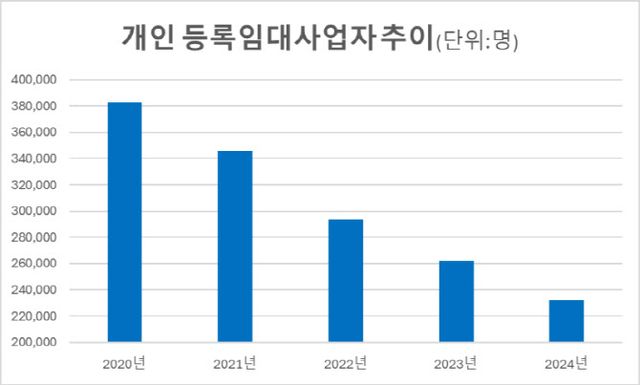 국토교통부 통계누리에 따르면 개인 등록 임대사업자는 2020년까지만 해도 38만 2908명이었으나 2024년 23만 2272명으로 5년간 15만명 넘게, 39% 감소했다.
