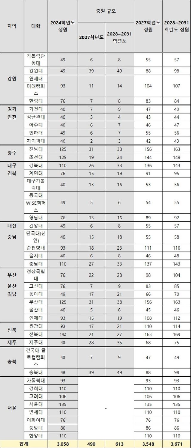 2028학년도부터 2031학년도까지 각 학년도의 의대 총 정원은 2024학년 대비 613명이 증가한 3671명이다. 2028학년도~2031학년도에도 서울을 제외한 지역 의대만 정원이 늘어난다.