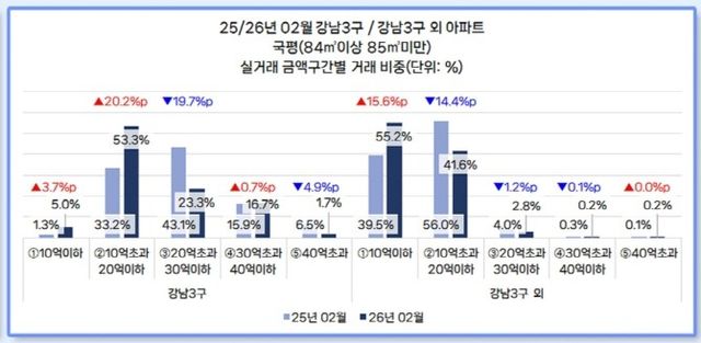 강남3구에서는 '20억 초과~30억 이하' 구간 실거래 비중이 지난해 2월 43.1%에서 올해 2월 23.3%로 19.7%p 줄었다. 20억 초과 구간 전체 비중(65.6%→41.7%) 역시 23.9%p 축소됐다. 반면 '10억 초과~20억 이하' 구간 비중의 경우(33.2%→53.3%) 20.2%p 늘었다. 강남권 국평 시장에서 거래 중심이 초고가 구간에서 한 단계 낮은 가격대로 이동한 셈이다.