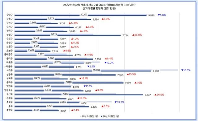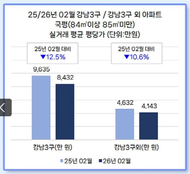부동산 플랫폼 다방이 국토교통부 실거래가 공개시스템 자료 토대로 2025년 2월과 2026년 2월 서울시 아파트 국평 평균 평당가를 비교한 결과, 강남3구 평균 평당가(9635만원→8432만원)는 12.5% 낮아졌다. 같은 기간 강남3구 외 지역(4632만원→4143만원) 역시 10.6% 하락했다.