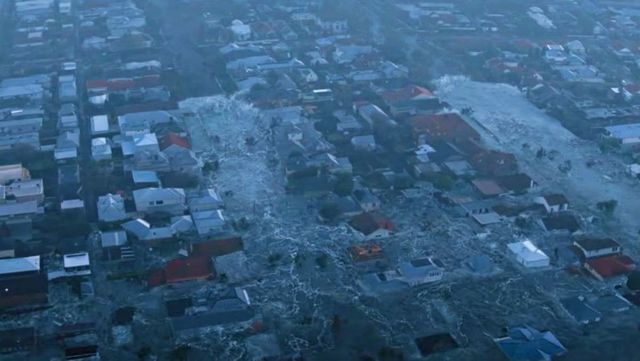 이 폭풍으로 인해 해안 마을 전체가 물에 잠기고 도로와 건물은 잔해로 뒤덮인다. 문제는 이 과정에서 바닷물이 도시 깊숙이 밀려 들어오며 상어들이 함께 들어온다는 점이다. 마을 곳곳에 물이 차오른 상황에서 사람들은 언제 어디서 공격이 벌어질지 모르는 공포 속에서 이동해야 한다.
