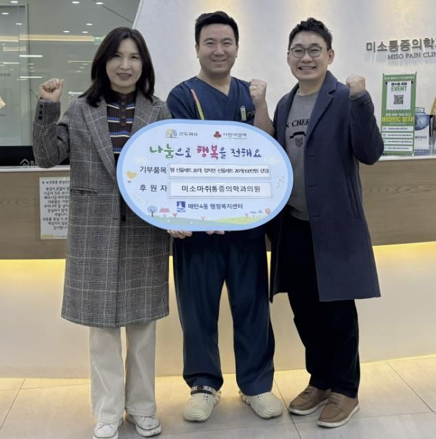 김승범 미소마취통증의학과 대표원장은 “작은 정성이지만 지역의 이웃들에게 따뜻한 마음이 전해지길 바란다”며 “앞으로도 지역사회와 함께하며 도움이 필요한 곳에 나눔을 이어가겠다”고 전했다.