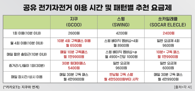 월 4회 미만으로 이용하는 소비자의 경우 단건 결제 방식이 유리하다. 10분 이내 단거리 이용 기준으로 쏘카일레클의 이용 요금이 약 2400원으로 가장 저렴하다. 반면 월 4회 정도 정기적으로 이용하는 경우에는 지쿠의 '10분 4회 구독패스(월 6500원)'가 비용 효율 측면에서 유리한 선택이 될 수 있다.