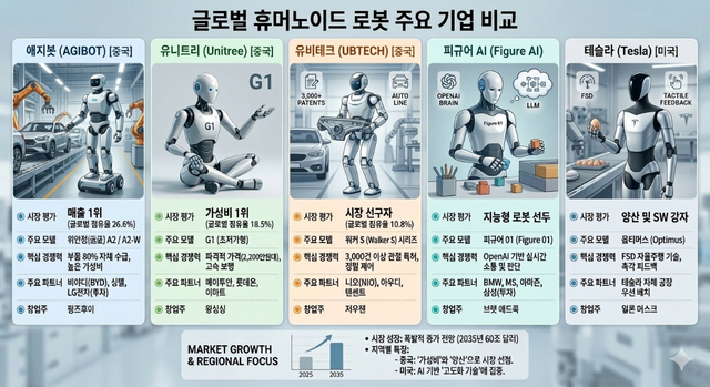 현재 휴머노이드 로봇의 시장을 주도하는 기업들은 대부분 중국 국적이다. 카운터포인트리서치에 따르면 지난해 글로벌 판매 매출액의 약 56%를 차지한 상위 3곳 기업은 모두 중국 회사였다. 이 중 매출 1위에 오른 상하이 소재 로봇기업 '애지봇(AGIBOT)'은 2023년 설립된 기업으로 '위안정(远征) 시리즈'라는 휴머노이드 로봇 라인업을 앞세워 시장 영향력을 넓혀나가고 있다. 지난해 1억4000만달러(한화 약 2000억원) 가량의 매출을 기록하며 글로벌 휴머노이드 시장 점유율 26.6%를 차지했다. 애지봇은 지난해 누적 생산량 5000대를 넘어서며 본격적인 양산 단계에 진입한 상태다.