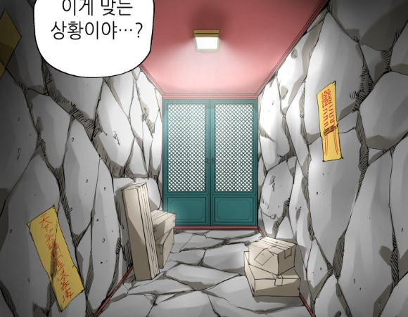 지하 깊숙한 곳, 입구에 붙은 기괴한 부적 너머로