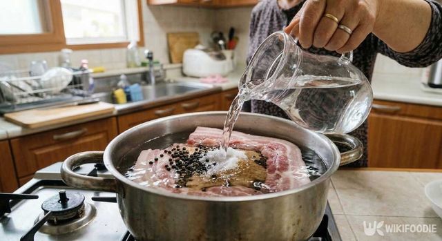 먼저 냄비에 삼겹살, 통후추, 소금, 설탕, 미원을 모두 넣고 고기가 완전히 잠기도록 물을 붓는다. 처음부터 약불로 맞추고 시작한다. 인덕션 기준 3~4단이면 적당하다. 팔팔 끓이지 않고 뭉근하게 1시간 삶는 것이 야들야들한 식감의 비결이다.