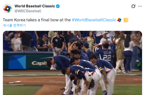 실제로 한국 대표팀 선수단의 '마지막 인사'를 두고 X(구 트위터)의 해외 야구 팬들은 한국 대표팀의 태도를 칭찬하는 반응을 이어갔는데, 일부 팬들은 "패배 속에서도 보여준 존중과 겸손이 진정한 스포츠 정신을 보여줬다"고 평가했다. 또 다른 팬 역시 "결과는 아쉬웠지만 한국 선수들이 팬들에게 고개 숙여 감사 인사를 전하는 모습은 매우 감동적이었다"고 반응했다.