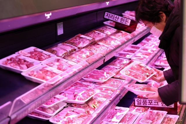 서울 시내 대형마트에서 시민들이 돼지고기 등 축산물을 살펴보고 있다. / 연합뉴스