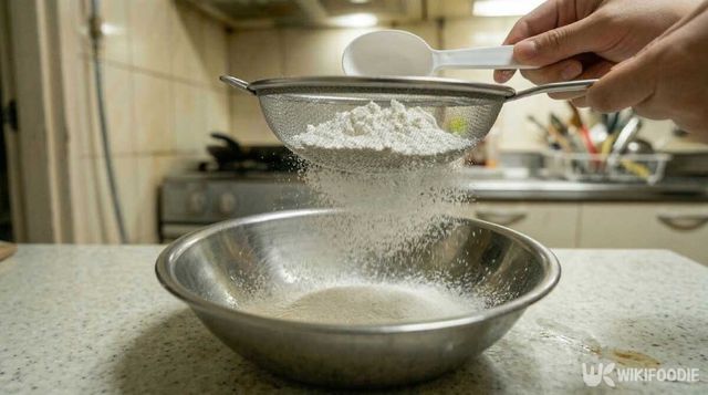 (4) 찹쌀가루와 타피오카 전분을 넣고 섞은 뒤 체에 걸른다.