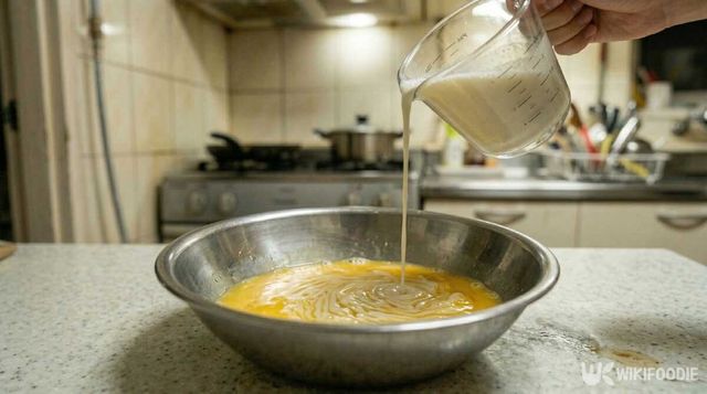 (3) 버터우유를 계란물에 조금씩 나눠 부으며 섞는다.