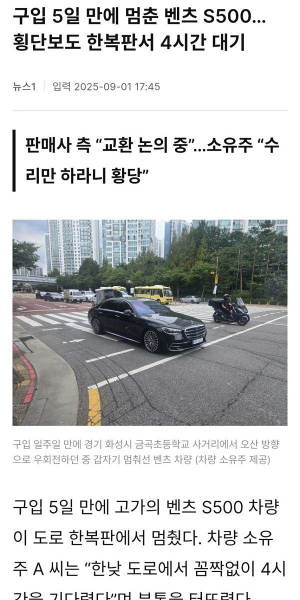 구입 5일 만에 멈춘 벤츠 S500…횡단보도 한복판서 4시간 대기
