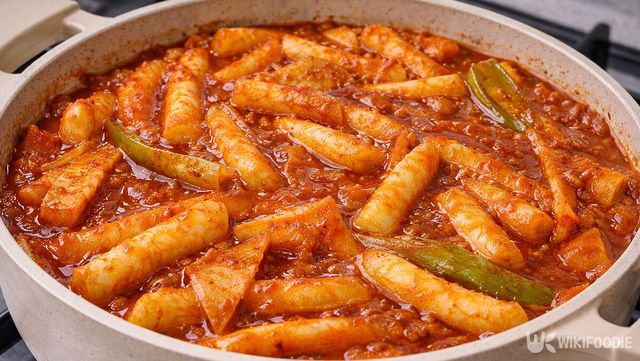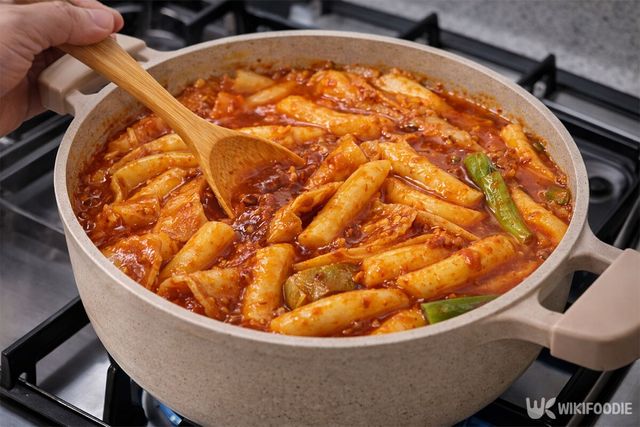 양념이 고루 섞였다면 불을 약하게 줄인다. 약불 상태에서 4분 정도 천천히 끓여낸다. 큰 철판에서 오래 조리하는 시장 방식을 재현하는 과정이다. 떡이 양념을 머금어 통통해지고 국물이 걸쭉해지면 완성이다.