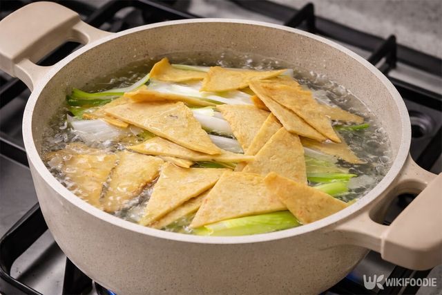 냄비 바닥에 길게 썬 대파와 어묵을 먼저 깐 뒤 물 600ml를 붓고 끓인다. 물이 끓기 시작하면 설탕 1큰술과 소금을 약간 넣는다.