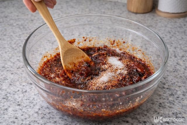 고춧가루 4큰술, 설탕 3큰술, 간장 2큰술, 굴 소스 2큰술, 고추장 2큰술을 넣는다. 가루 형태의 양념을 먼저 넣고 액체 양념을 나중에 넣으면 뭉침 없이 잘 풀린다. 굴 소스는 감칠맛을 깊게 만드는 비결이다.