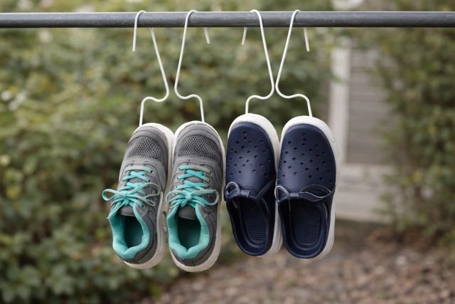 이렇게 변형된 옷걸이를 압축봉이나 베란다 쪽에 차례로 걸면, 바닥 면적을 전혀 차지하지 않는 '수직 신발장'이 완성된다. 특히 세탁 후 건조가 필요한 운동화나 슬리퍼를 보관할 때 통풍이 원활하기 때문에 위생 관리에도 효과적이다.