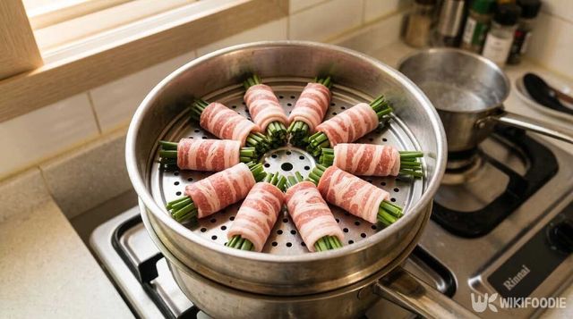 5. 부추를 감싼 대패삼겹살을 찜기에 올리고 뚜껑을 닫아 강불에서 5분간 찐다.