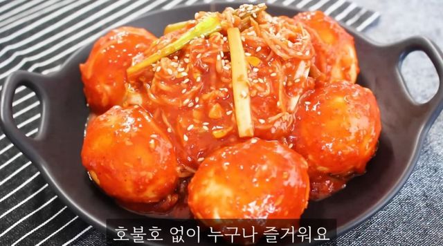 양념장은 남겨둔 채수에 고추장 수북하게 두 스푼, 고춧가루 한 스푼, 굴소스 한 스푼, 소주 한 스푼, 다진 마늘 한 스푼, 설탕 한 스푼, 후추를 넣어 만든다. 양념이 뭉치지 않게 잘 섞은 후, 미리 10분간 삶아 껍질을 벗겨둔 계란 5개를 냄비에 넣는다. 양념이 계란에 적당히 베도록 2~3분간 팔팔 끓인다.