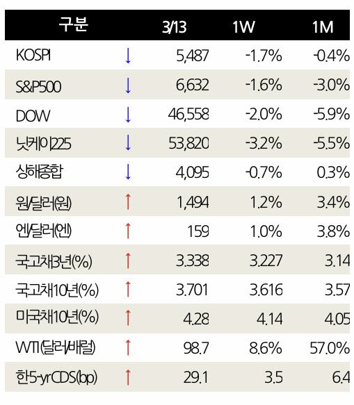 허재환 유진투자증권 연구원은 “코스피는 이란 전쟁 장기화 우려로 두 주째 하락했다. 코스닥은 액티브 ETF(상장지수펀드) 출시와 함께 약보합권 하락에 그쳤다”면서 “IEA의 사상 최대 전략 비축유(4억 배럴) 방출 소식에도 이란의 초강경 입장으로 브렌트유는 2022년 8월 이후 처음으로 100달러를 상회했다. 원·달러 환율도 1490원대로 상승했다”고 분석했다.
