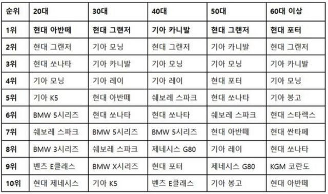 40대에서는 이런 변화가 더 뚜렷해졌다. 카니발이 1위에 오르며 패밀리카 수요가 전면에 등장했고 그랜저가 뒤를 이었다. 여기에 제네시스 G80과 벤츠 E클래스, BMW 5시리즈 등 프리미엄 세단도 순위권을 지켰다. 공간 활용성과 함께 편의성, 승차감, 브랜드 가치까지 함께 고려하는 소비 패턴이 드러난 대목이다. 또 현대 포터가 9위에 포함된 점도 눈에 띄었다.