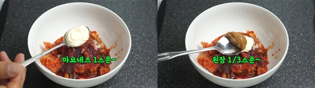 다진 김치는 그릇에 담은 뒤 양념을 더한다. 설탕 반 스푼, 간장 한 스푼, 참기름 두 스푼, 다진 대파를 넣고 여기에 마요네즈 한 스푼과 된장 3분의 1 가량을 더해 섞는다. 된장이 들어간다고 하면 어색하게 느껴질 수 있지만, 실제로는 김치의 감칠맛을 한층 끌어올리는 역할을 한다. 마요네즈는 지방 성분 덕분에 볶음밥의 고소함과 부드러운 풍미를 더해준다.