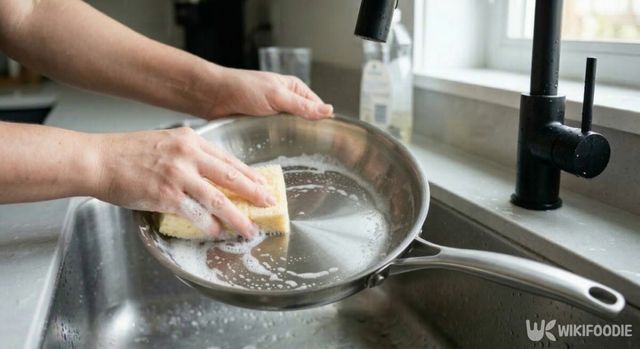 부드러운 수세미나 천연 수세미에 주방세제를 묻혀 거품을 낸 뒤 팬 전체를 천천히 닦는다. 바닥뿐 아니라 옆면과 가장자리도 함께 닦아준다. 이후에는 흐르는 물로 여러 번 헹궈 세제가 남지 않도록 한다.