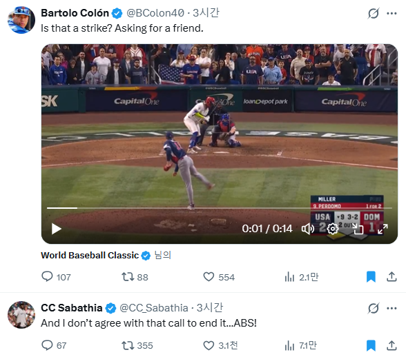 논란은 사회관계망서비스(SNS)에서도 빠르게 확산됐다. MLB 명예의 전당 헌액자이자 사이영상 수상 경력을 지닌 전 뉴욕 양키스 투수 CC 사바시아는 자신의 X(구 트위터)를 통해 "나는 그 마지막 판정에 동의할 수 없다. 이제는 ABS를 도입해야 한다"고 주장했다.