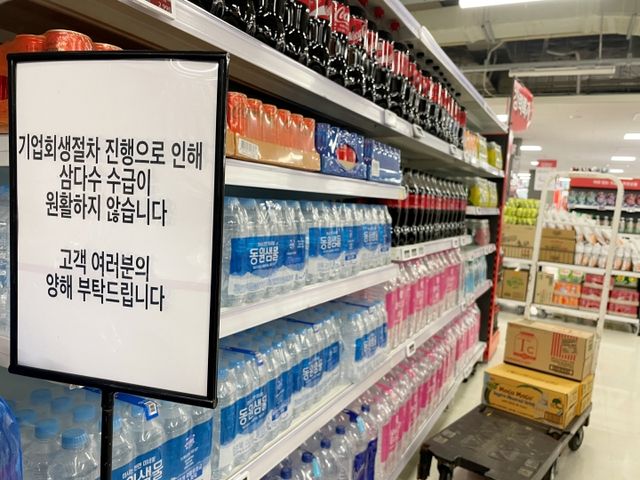 16일 오전 홈플러스 서귀포점에 ‘기업회생절차 진행으로 삼다수 수급이 원활하지 않다’는 안내판이 설치됐다. 양유리기자