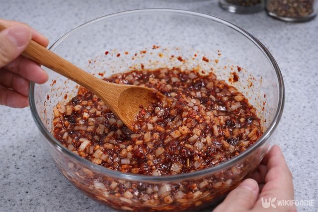 여기에 미리 다져둔 양파, 마늘, 대파를 넣고 한 번 더 골고루 섞는다. 채소 향이 양념에 자연스럽게 배어든다.