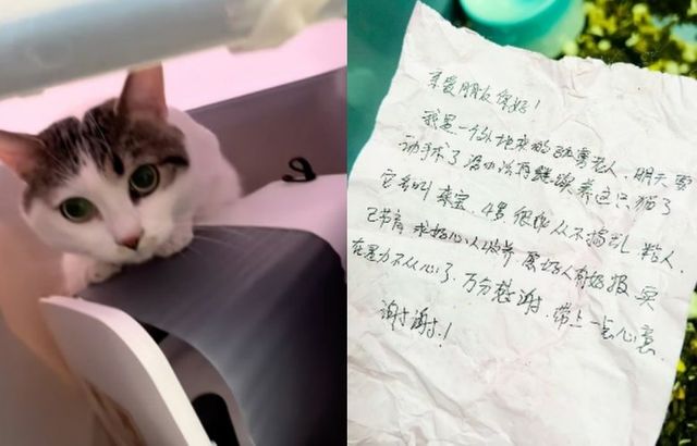 쑨 씨는 처음에는 무책임한 주인이 고양이를 버리고 간 줄 알고 화가 났지만 자세히 이동장을 살펴보다가 구겨진 분홍색 메모지와 현금을 발견했다.