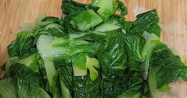삶은 봄동은 찬물에 한 번 헹군 뒤 물기를 가볍게 짠다. 이렇게 하면 색이 선명하게 유지되고 식감도 깔끔해진다. 이후 먹기 좋은 길이로 썰어 준비한다.