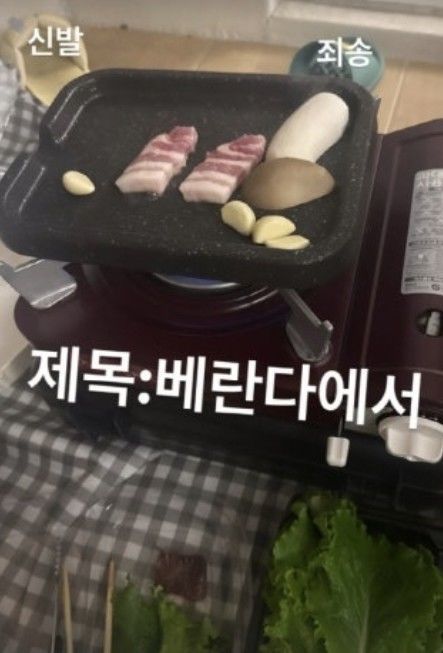 공개된 사진에는 아파트 베란다에 불판을 놓고 삼겹살과 버섯, 마늘 등을 굽는 모습이 담겼다. 그룹 ‘러블리즈’ 출신 방송인 이미주는 소량씩 고기를 굽는 장면으로 눈길을 끌었다.