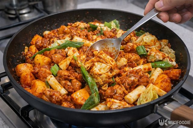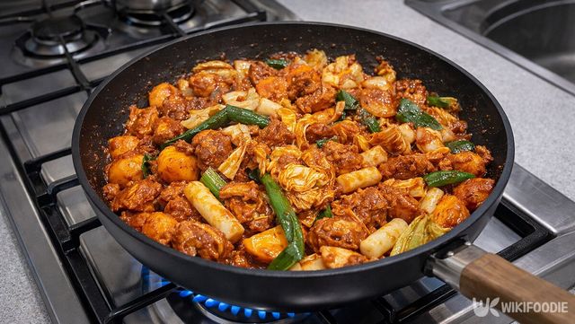 팬에 식용유를 두르고 양념에 재운 닭고기를 먼저 볶는다. 고기 겉면이 익으면 딱딱한 고구마와 감자를 넣고 중불에서 익힌다. 만약 양념이 타는 듯하면 물을 몇 큰술 넣어 촉촉하게 조절한다.