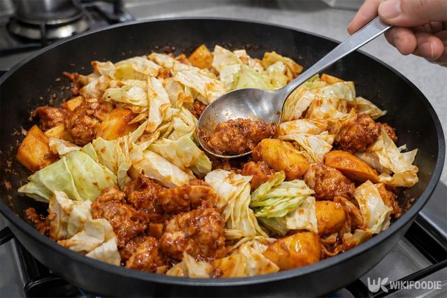 고기가 어느 정도 익으면 양배추, 양파와 함께 남겨두었던 양념을 모두 넣는다. 뚜껑을 잠시 덮어두면 채소에서 수분이 나와 양념이 골고루 퍼진다.