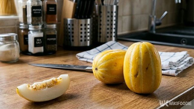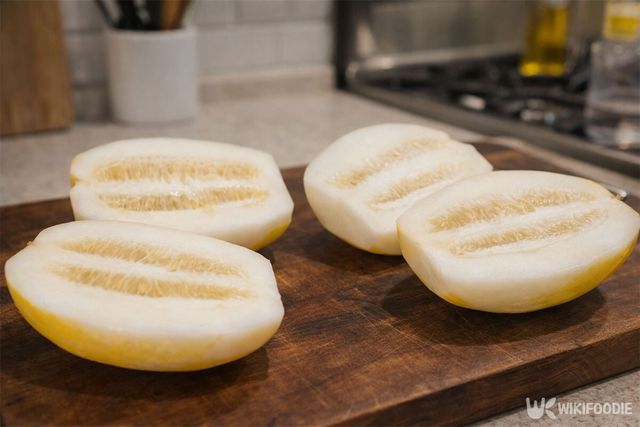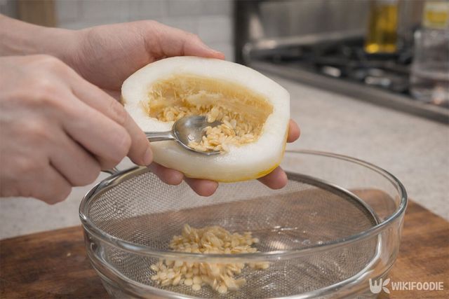 손질한 참외는 반으로 자른 뒤 숟가락을 사용해 안쪽의 씨와 속 과육을 따로 파낸다. 씨가 붙은 속 부분은 단맛이 강하므로 버리지 않고 따로 모아둔다.