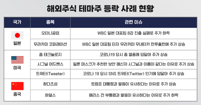 바로 직전에도 비슷한 일이 있었다. 지난 10일 WBC 조별리그 체코전에서 메이저리그(MLB) 시카고 화이트삭스 소속 무라카미 무네타카 선수가 8회 말 쐐기 만루 홈런을 터뜨리자 다음날인 11일 증시에서는 자동차 거울 제조사 '무라카미 코퍼레이션'의 주가가 2% 가량 상승 출발했다. 당시 일본 투자자들 사이에선 "이름이 무라카미라 샀는데 정말 올랐다" "WBC 수혜주" "지금 매수해 준결승쯤 매도하면 차익을 볼 수 있다" 등 기업 본질과는 무관한 황당한 투자 전략이 공유되기도 했다.