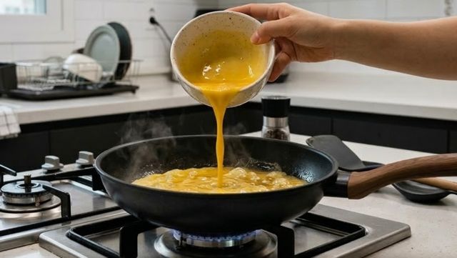 계란 푼 물을 후라이팬에 붓는 모습. AI가 생성한 자료사진.