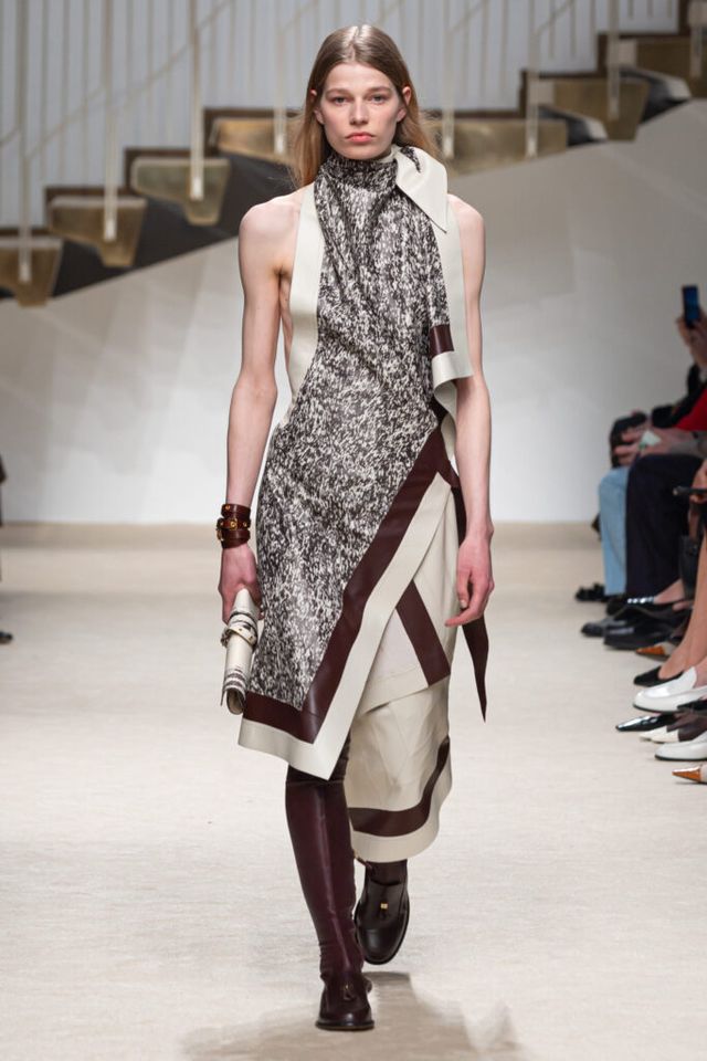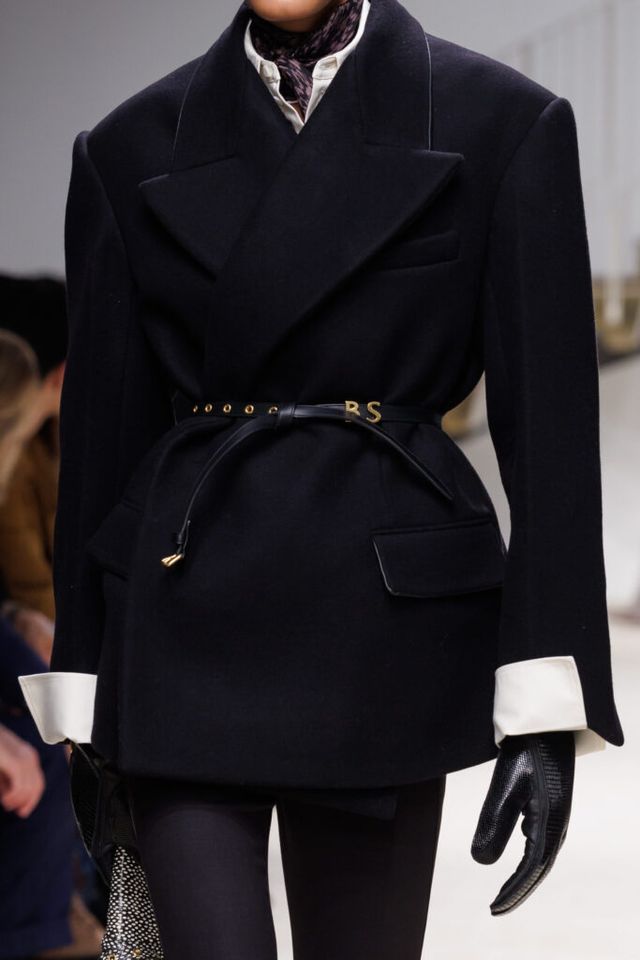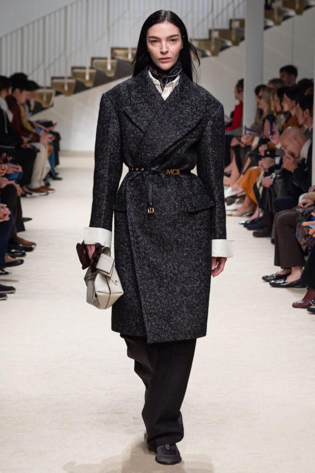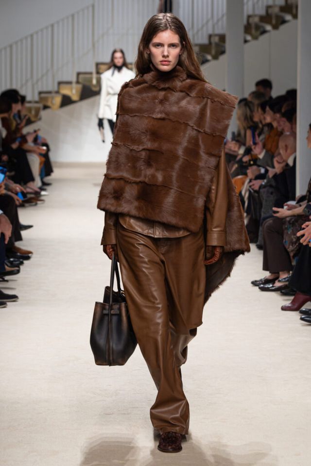 조형이라고 말한 까닭은 이번 컬렉션의 실루엣이 조각에 가깝기 때문이다. 탐부리니는 이번 시즌의 영감을 마르타 판과 헨리 무어의 조각에서 얻었다고 말했다. 두 작가의 작업은 유기적인 덩어리와 부드러운 곡선을 통해 몸을 둘러싸는 형태를 만든다. 단단하지만 경직되지 않고, 묵직하지만 유연한 조형이다. 패션에서 주로 일컫는 ‘건축적’인 형태와는 결이 다르다. 몸 위에서 덩어리를 이루며 감싸는 부드러운 조각에 가깝다.포니스킨으로 만든 케이프는 그 조각적 접근을 가장 직접적으로 보여준다. 코트 위에 얹힌 각진 케이프는 몸을 감싸지만 완전히 완전히 덮지는 않았다.견고하지만 경직되지 않은 형태로 몸 위에 얹혀 있었다.