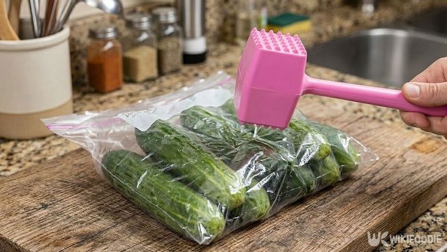2. 비닐에 오이를 넣고 칼등이나 망치로 겉면이 갈라질 때까지 가볍게 두드린다.