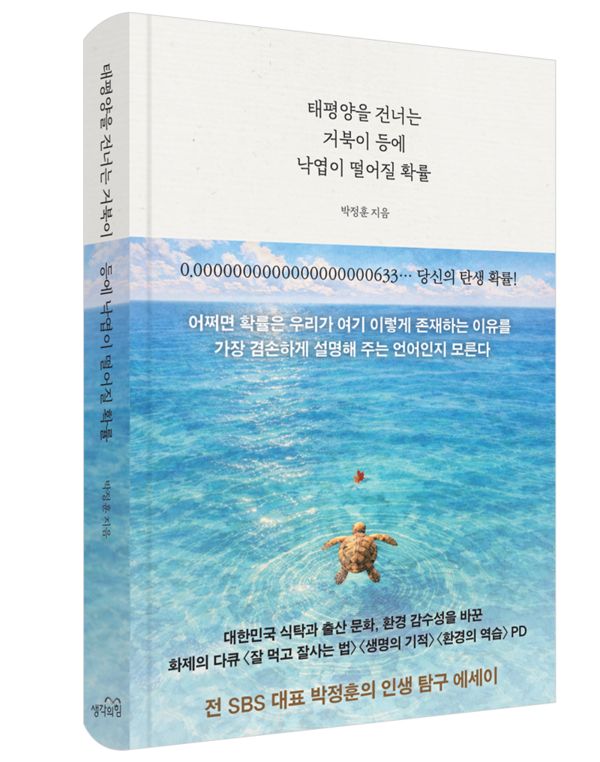 “당신이 여기 있다는 것 자체가 기적에 가깝다.” 다큐멘터리 PD이자 전 SBS 대표이사로 한국 방송사를 대표해온 박정훈이 신간 『태평양을 건너는 거북이 등에 낙엽이 떨어질 확률』에서 들고 나온 첫 문장이다. 제목 그대로, 태평양을 건너는 거북이 등에 낙엽이 떨어질 확률에 비유될 만큼 희박한 숫자에서 시작된 한 인간의 삶을, 그는 냉정한 통계가 아닌 ‘경외의 언어’로 다시 써 내려간다.