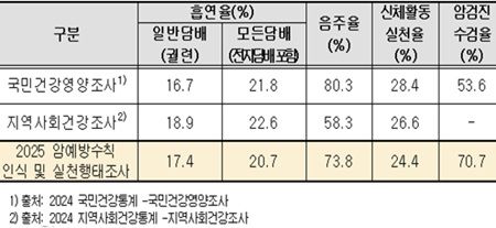 금연의 경우 인식도 91.3%, 실천율 79.3%로 모두 높은 수준을 유지했으며, 암검진 실천율도 70.7%로 국가암검진 체계가 안정적으로 정착됐음을 보여줬다.