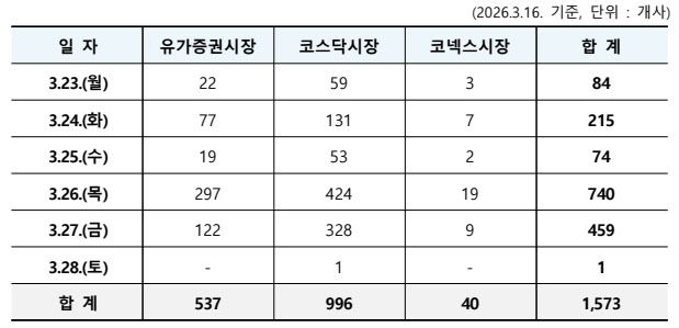 시장별로는 코스닥 쏠림이 더 두드러졌다. 3월 넷째 주 주총 예정 기업 1573개사 가운데 코스닥 상장사가 996개사로 가장 많았고, 이 중 424개사가 26일 하루에 주총을 연다. 유가증권시장 역시 같은 날 297개사가 주총을 개최하면서 주요 상장사의 의사결정이 하루에 집중될 전망이다.