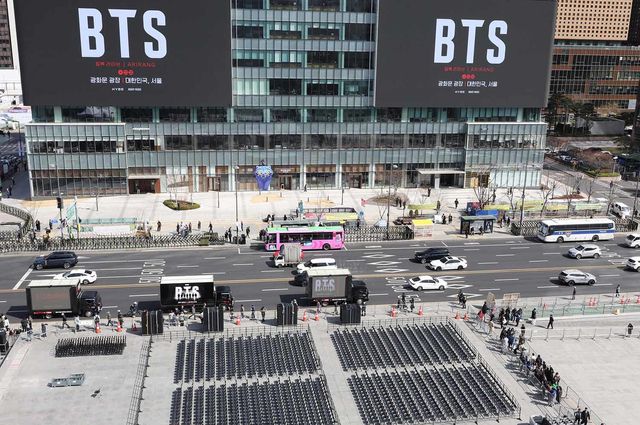 그룹 방탄소년단(BTS)의 광화문 공연을 앞둔 19일 서울 광화문광장에서 공연 준비작업이 이뤄지고 있다. / 뉴스1 (공동취재)
