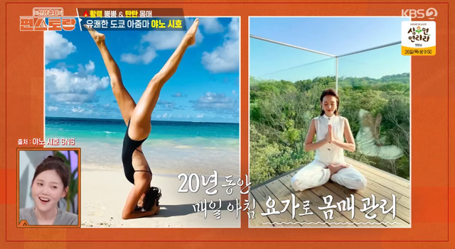 이날 한국의 숙소에서 아침을 맞은 야노시호는 레깅스 차림으로 요가 매트부터 폈다. 그는 “20년 동안 매일 하고 있다”면서 머리로 지탱해 곧게 서는 고난도 동작도 선보이기도 했다.