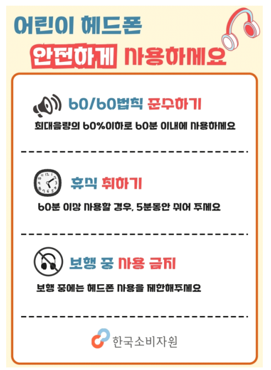 소비자원은 어린이의 경우 헤드폰 음량을 60% 이하로 설정하고, 하루 1시간 이내로 사용한 뒤에는 반드시 휴식을 취하게 하는 등 보호자의 지도가 필요하다고 강조했다.