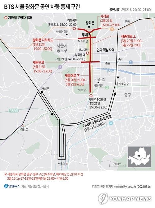 21일 경찰 및 서울시 등에 따르면, 핵심 구간인 세종대로(광화문~시청)는 공연 다음 날인 22일 오전 6시까지 차량 통행이 전면 금지됩니다.
