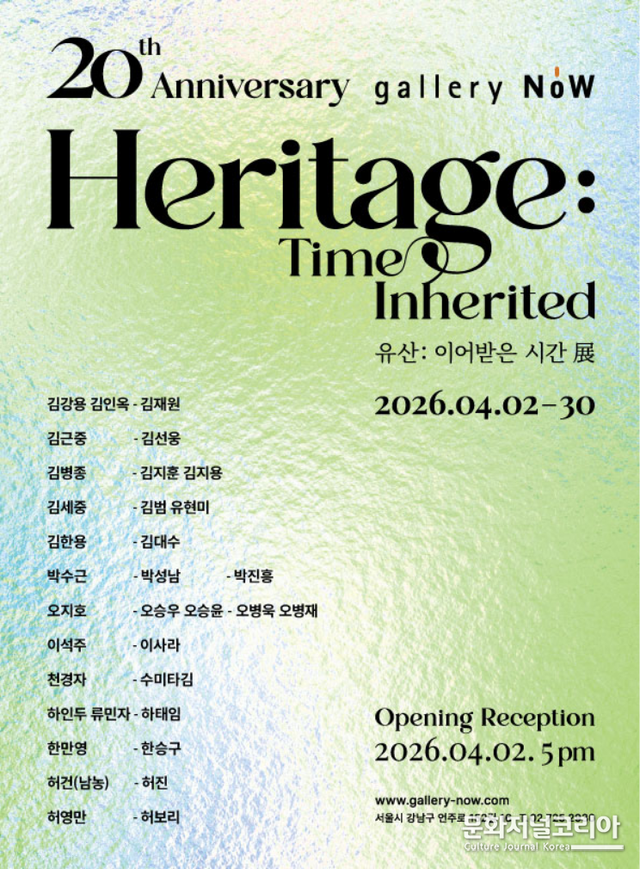 문화저널코리아 오형석 기자 |서울 강남의 갤러리나우(대표 이순심)가 개관 20주년을 맞아 한국미술의 깊은 뿌리를 정면으로 꺼내 든다. 오는 4월 2일부터 30일까지 열리는 기념전 'Heritage: Time Inherited(유산 : 이어받은 시간)'은 단순한 축하전이 아니다. 한국 미술계에서 1대, 2대, 3대에 걸쳐 예술적 가치와 작가 정신을 이어온 가족 작가들을 한자리에 모아, '예술은 어떻게 세대를 넘어 살아남는가'라는 본질적인 질문을 던지는 대형 기획전이다.