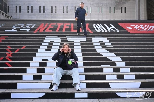 그룹 방탄소년단(BTS) 컴백 라이브 : '아리랑' 공연을 이틀 앞둔 19일 오후 서울 종로구 광화문광장 인근에 설치중인 무대를 찾은 시민들이 기념촬영을 하고 있다. 사진=강민석 기자 kms@newsway.co.kr