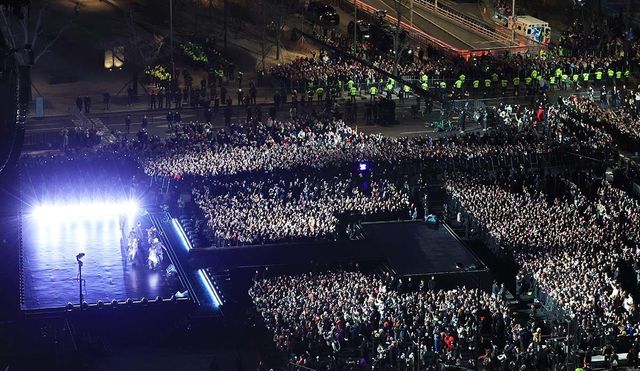 광장 공식 좌석은 A구역(스탠딩)·B구역(지정석)·C구역(추가 좌석)으로 나뉜 2만2000석 규모였다. 광장 출입은 서쪽 15개, 동쪽 16개를 합쳐 모두 31개 게이트로만 가능했다. 테러·위험물 반입을 막기 위해 게이트마다 금속탐지기를 설치했고, 내부에는 경찰특공대도 자리를 잡았다. 인파가 한꺼번에 몰리자 상당수 게이트는 추가 유입을 차단했다. 북창동 인근 게이트에는 공연 시작 직전까지도 약 75m가량 줄이 늘어섰지만 경찰은 진입을 막았다.