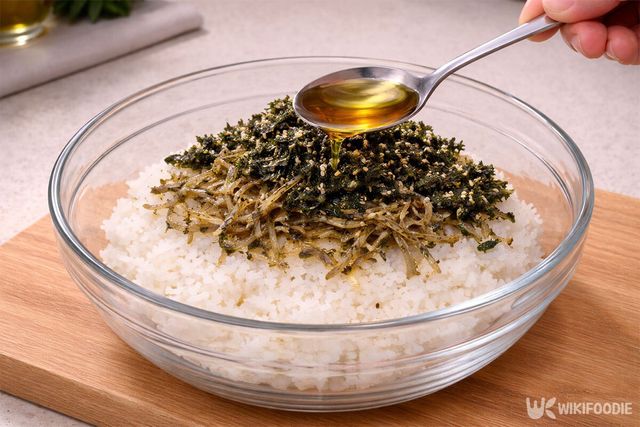 고소함을 살려줄 참기름 1큰술을 넣는다. 너무 많이 넣으면 밥이 기름져서 뭉치기 어려우므로 1큰술이면 충분하다.