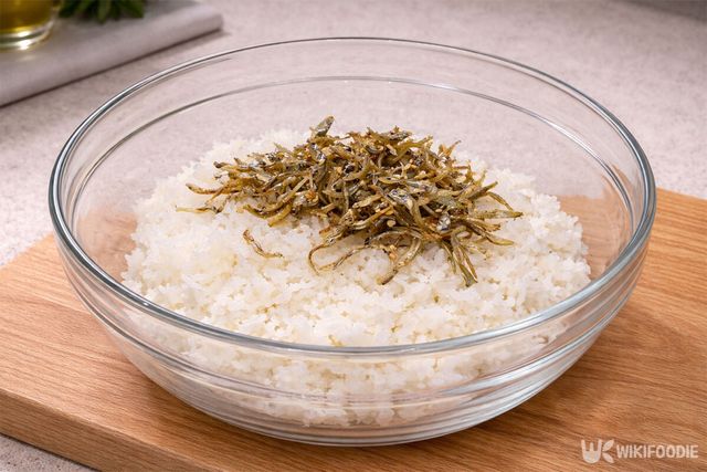 2. 볼에 밥을 담고 볶은 멸치 1/2컵을 넣는다.